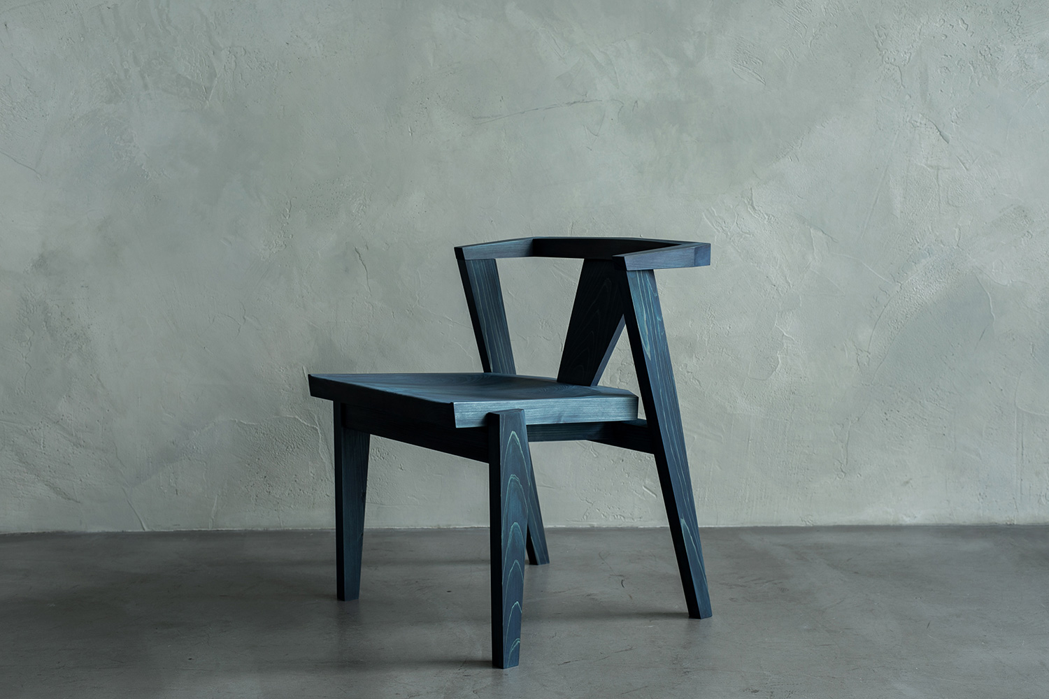 無垢材の面の美しさが藍染めによって強調されたアームチェアです。