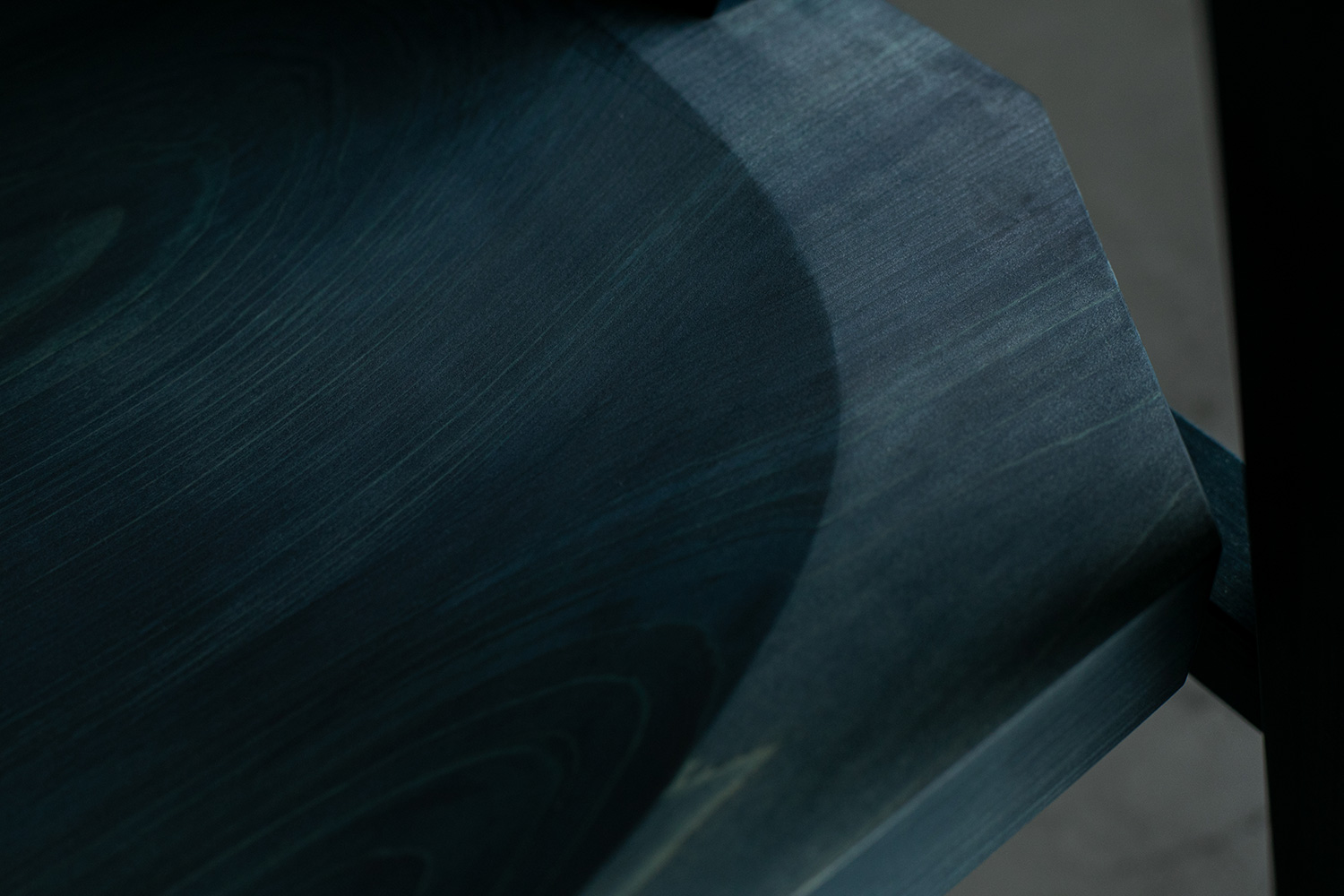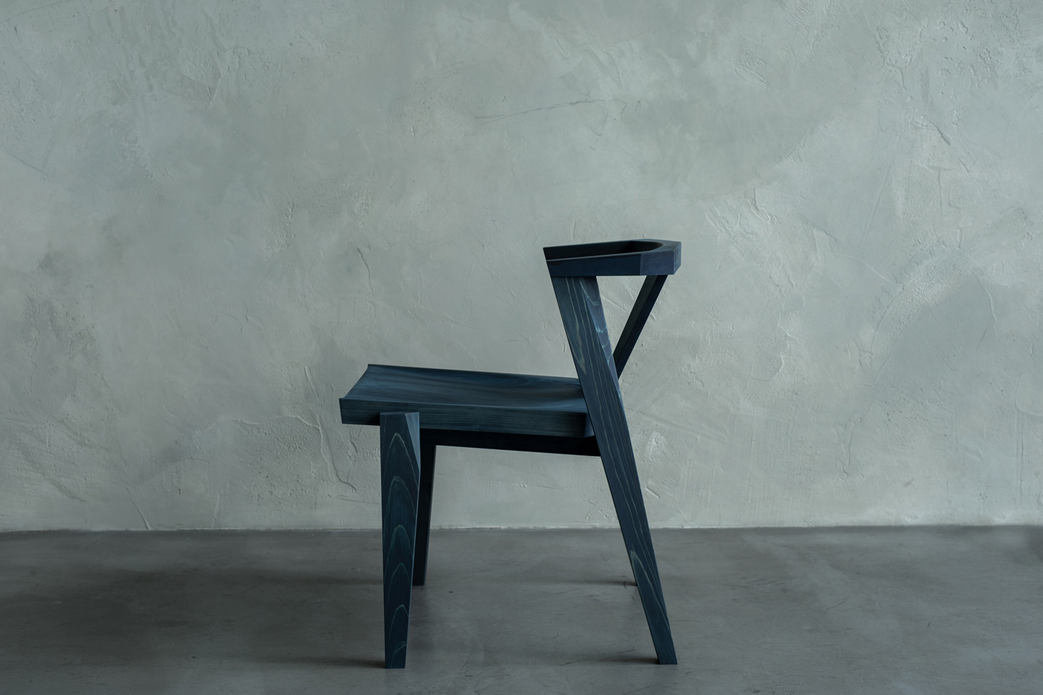 無垢の檜材を敢えてエッジが強調されるように精巧に切り出されたパーツによって構成されています。ゆったりとした座面には、藍染めされた檜の木目の美しいグラデーションが表れています。短くコンパクトなアームレストと背もたれの高さが一直線に揃ろうことでシンプルで現代的なデザインとなっています。全てのパーツは、職人の手作業により丁寧に削り出され、木目の美しさが最大限に活かされた優しい肌触りの椅子です。前脚から背面へとつづく曲面の木目が藍で染め上げることで際立ち、素材特有の油分が表面に美しいグラデーションを生み出します。テーブルへの出入りをスムーズにしながらも、ゆったりとした座り心地を両立させています。